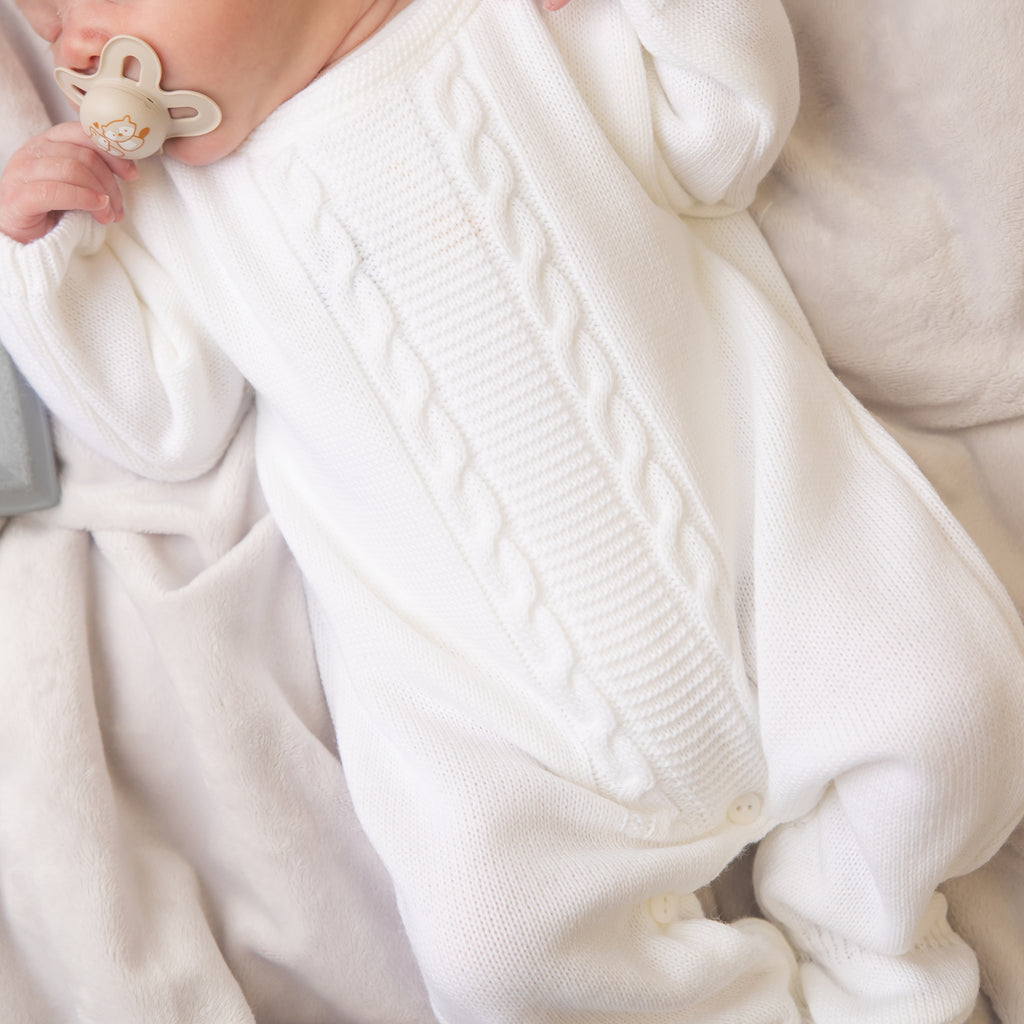 Introducing our Unisex White Cable Knitted Onesie, the perfect cosy and comfortable outfit for your little one. Made from premium quality knitted fabric, this onesie features a classic cable-knit pattern that exudes timeless charm and elegance.