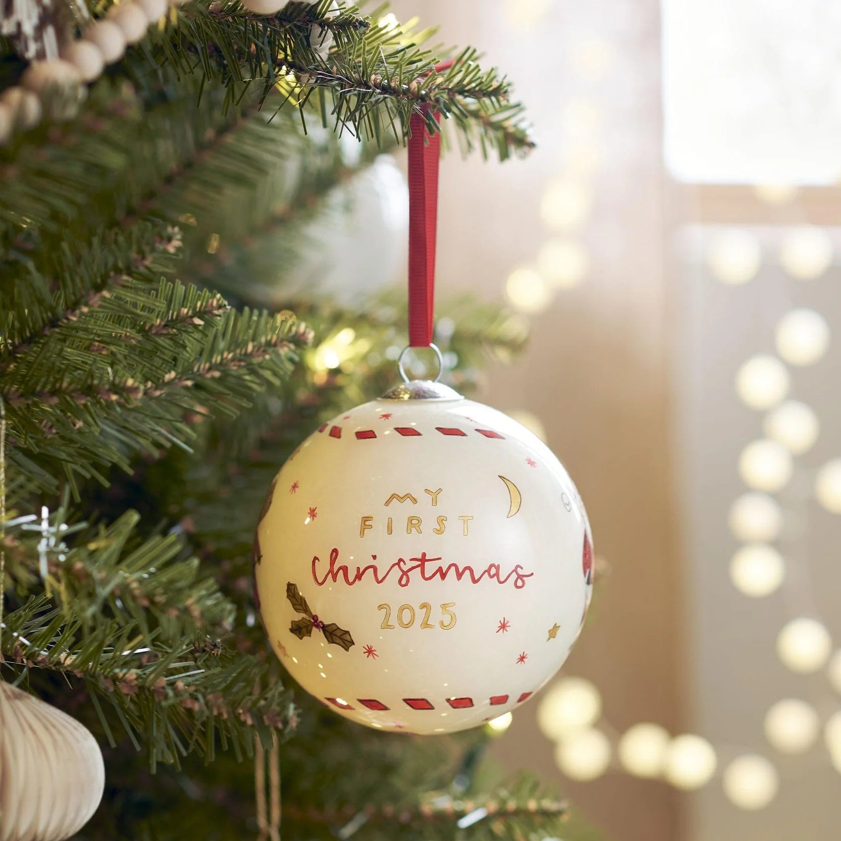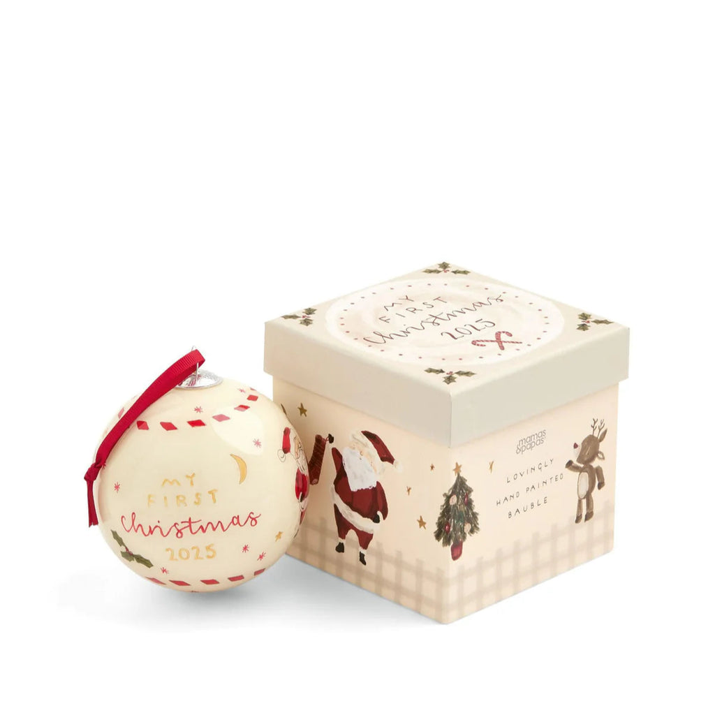 Celebrate your special family milestone with Mamas & Papa's lovingly hand-painted ‘My First Christmas’ glass bauble. A heartfelt addition to your décor, it features the year alongside their beloved festive friends – Santa, Boo Bear, Beau Bunny, and Dash Reindeer. Beautifully presented in a matching box for safekeeping, it’s a joy to both display and treasure.