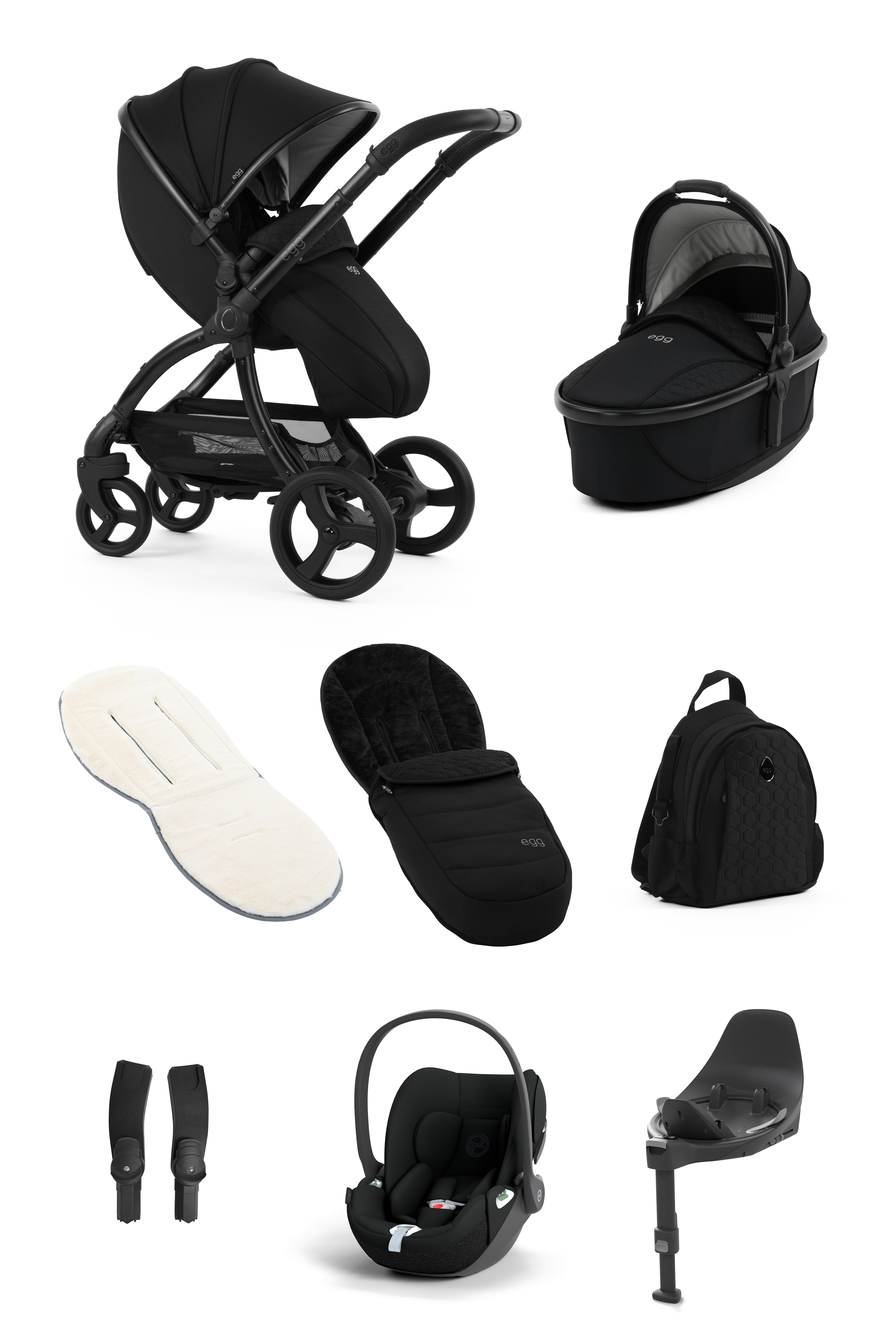 Taking the guesswork out of the perfect travel system, this Luxury bundle comes with the complete egg3 stroller with seat liner, matching carrycot, footmuff, backpack changing bag, car seat adaptors, Cybex Cloud T & Base T.