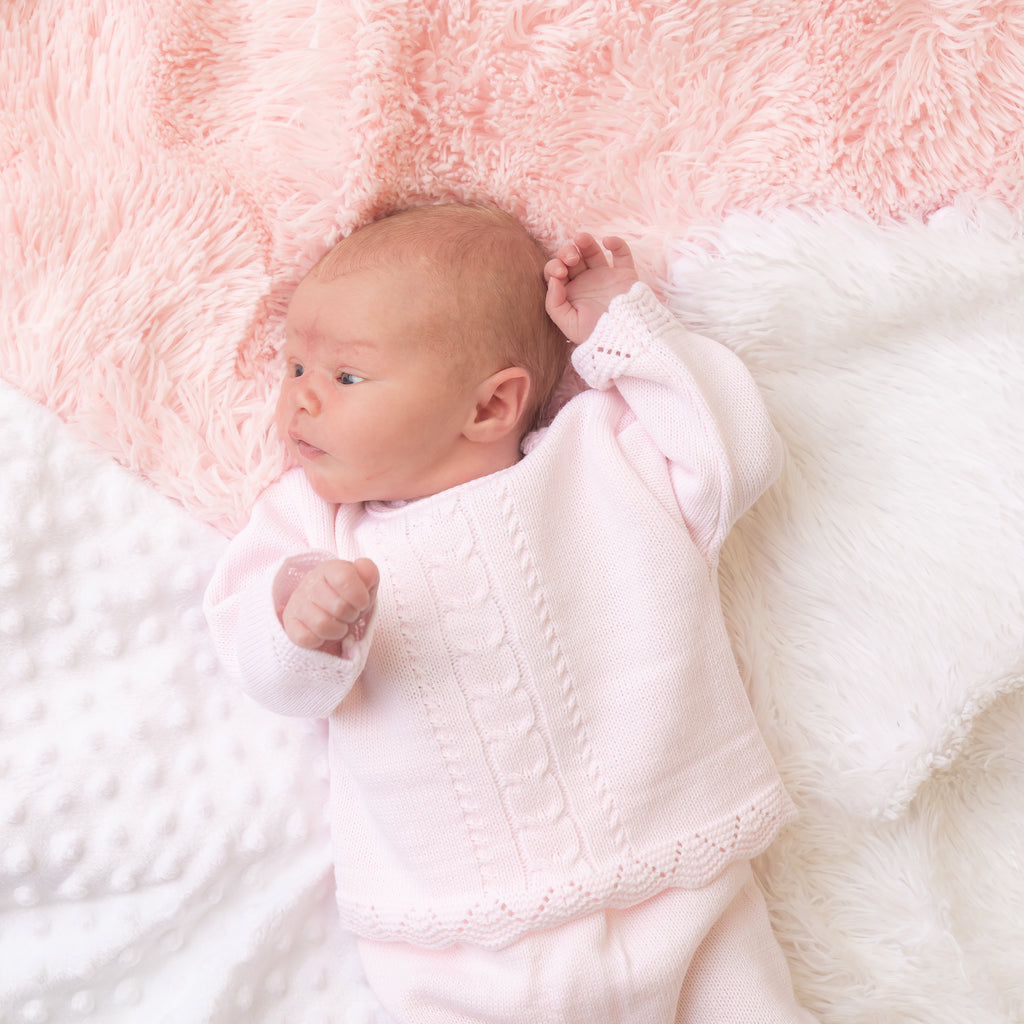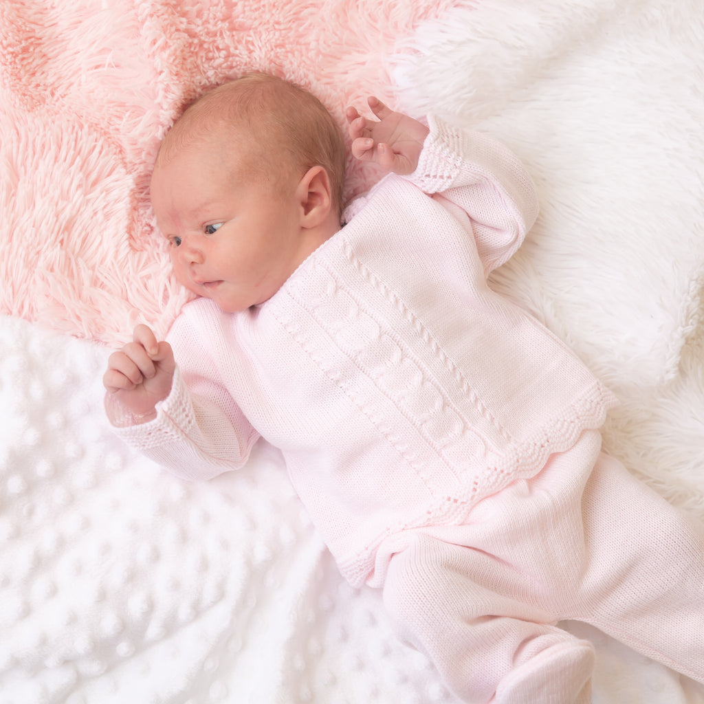 This charming Girls Pink Two-Piece Knitted Set is a delightful addition to your little girl's wardrobe. This beautiful knitted set features a soft, high-quality knitted fabric in a gentle pink hue, making it perfect for any occasion.