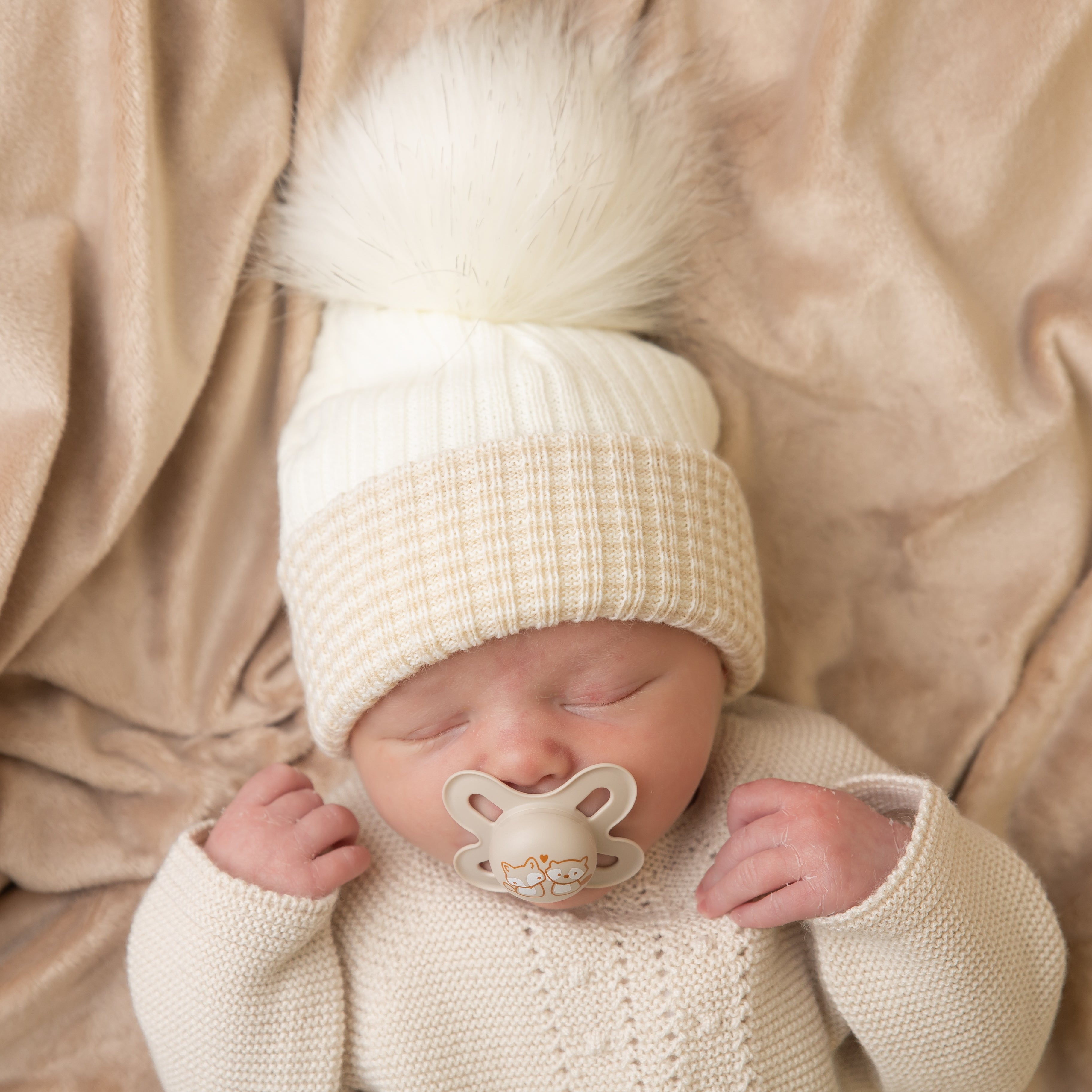 First Size Ivory & Beige Ribbed Fur Single Pom Hat