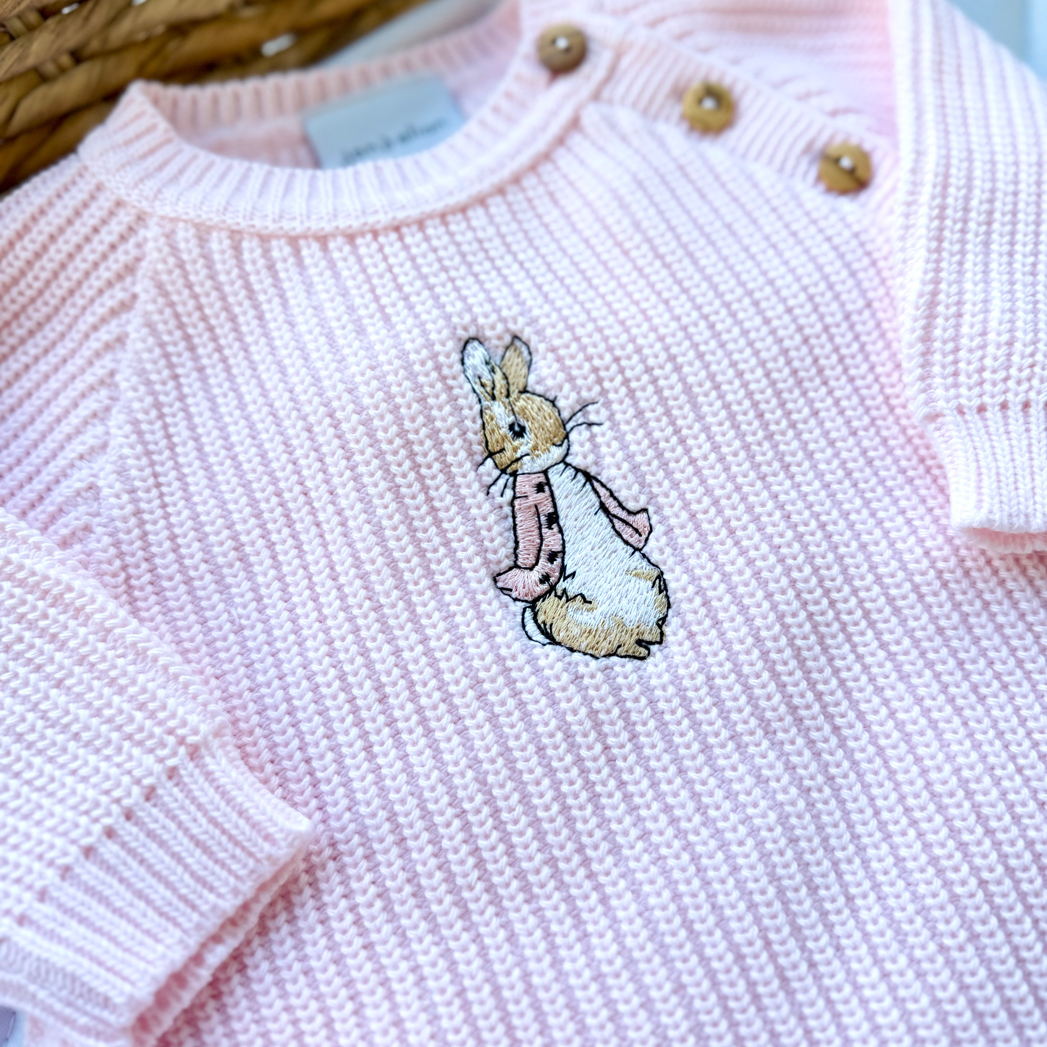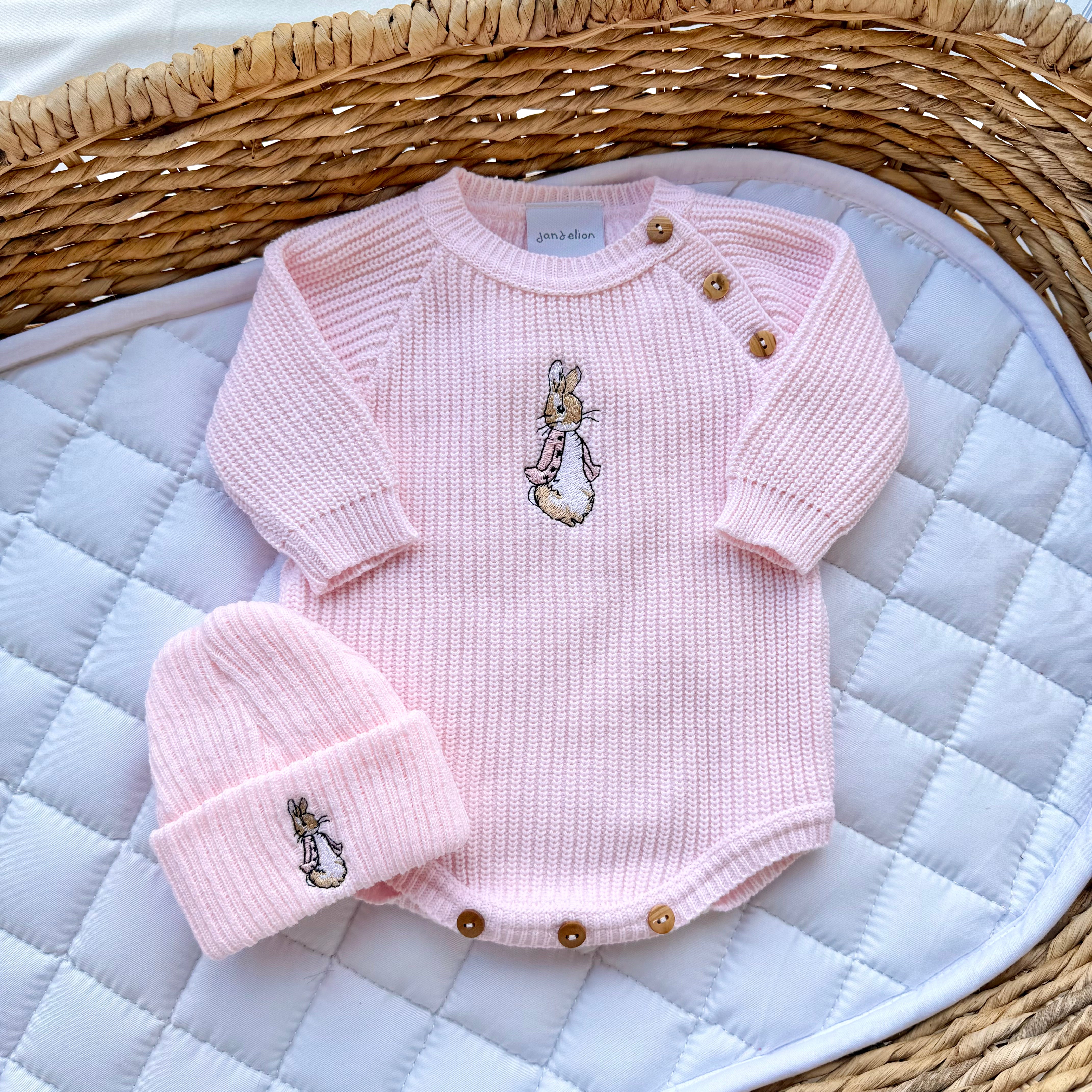 A gorgeous new arrival from Dandelion. A pink long sleeved knitted fisherman style romper with wooden button fastening and traditional rabbit embroidery detailing. The matching hat completes this adorable set!