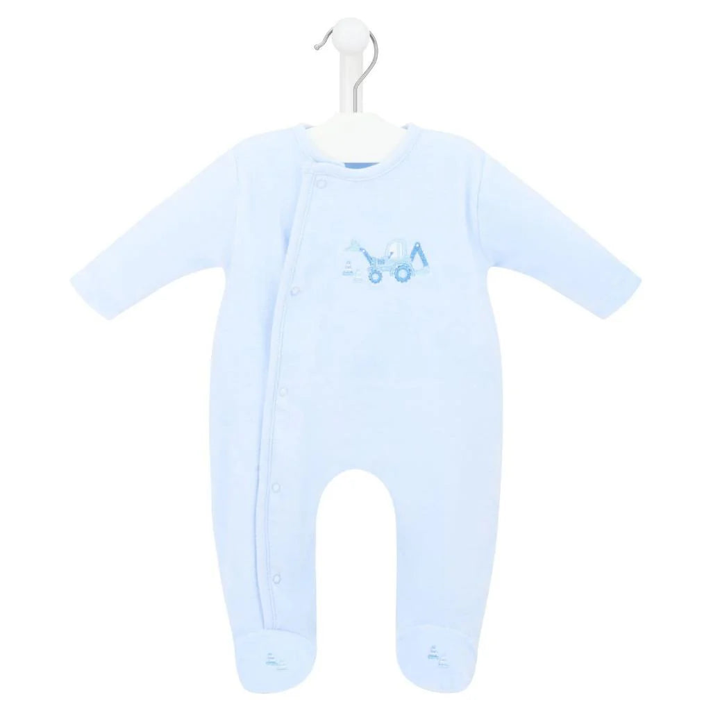 The cutest new arrival for their first wardrobe! A super soft cosy velour sleepsuit featuring 'digger & cones' applique and little traffic cones on feet.