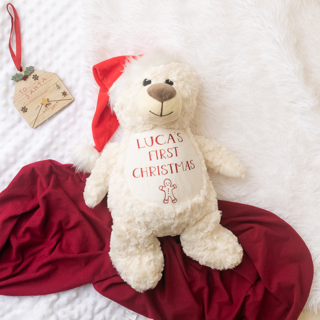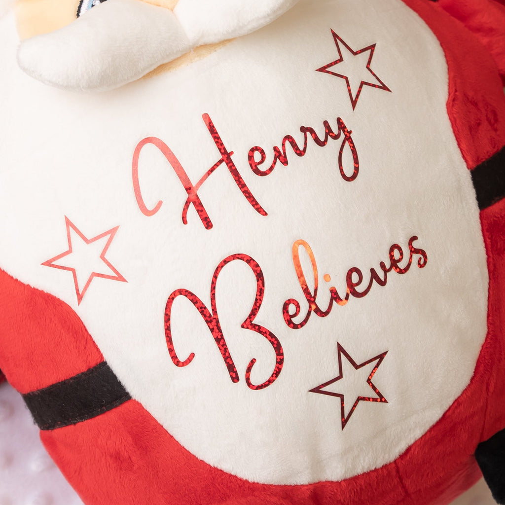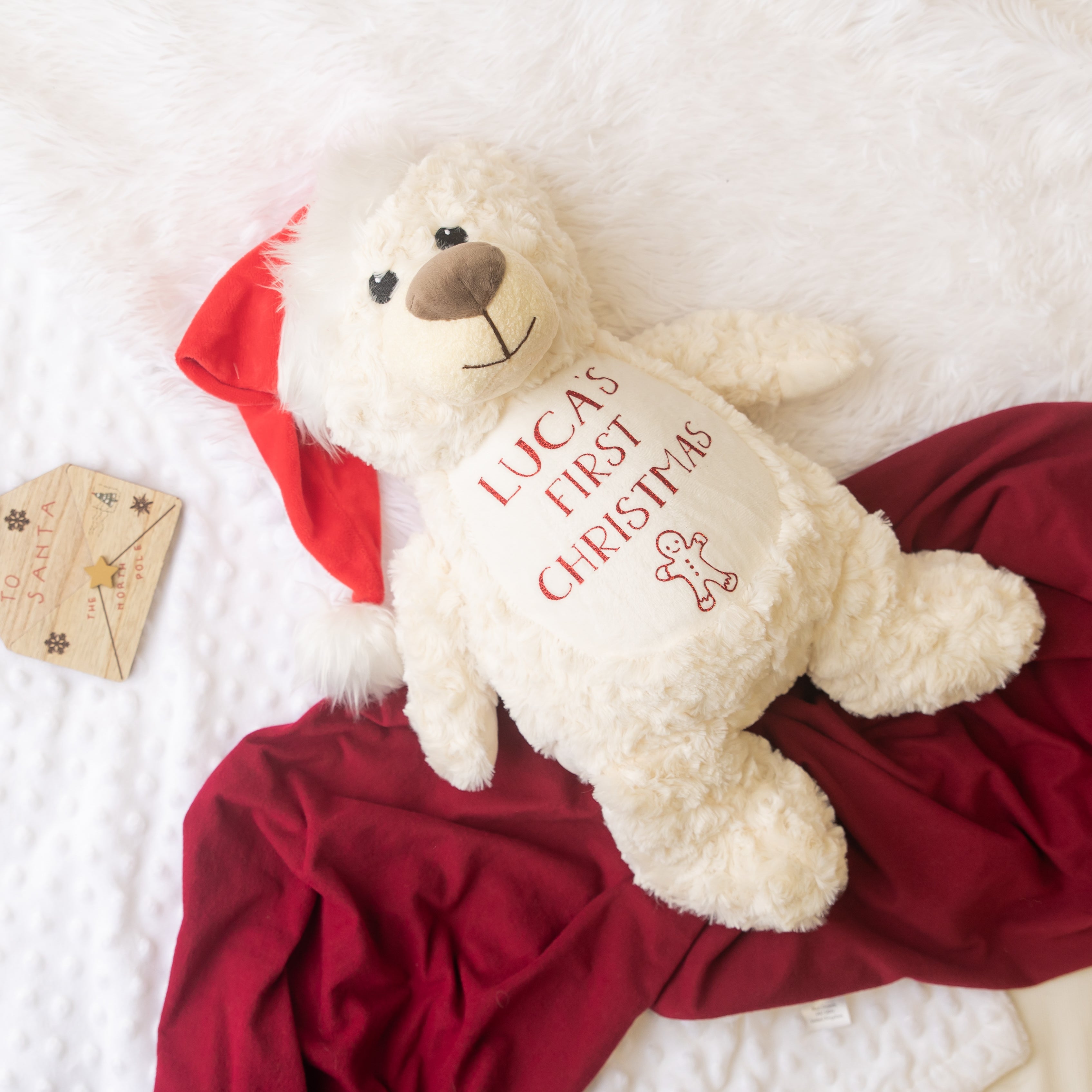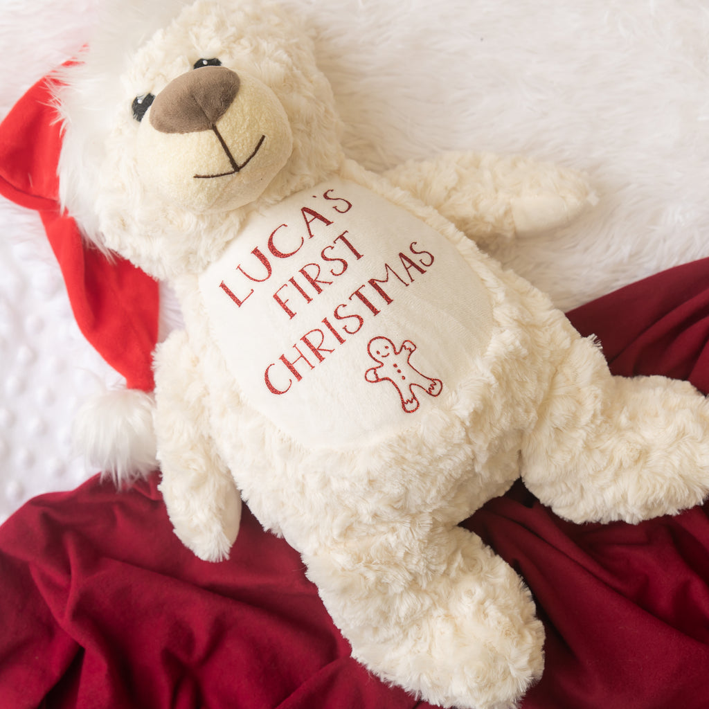 Celebrate your little one’s first magical Christmas with our beautifully soft and cuddly large bear. This adorable teddy features plush cream fur, a jolly red Santa hat, and a festive belly which can be personalised with their name for an extra special touch.