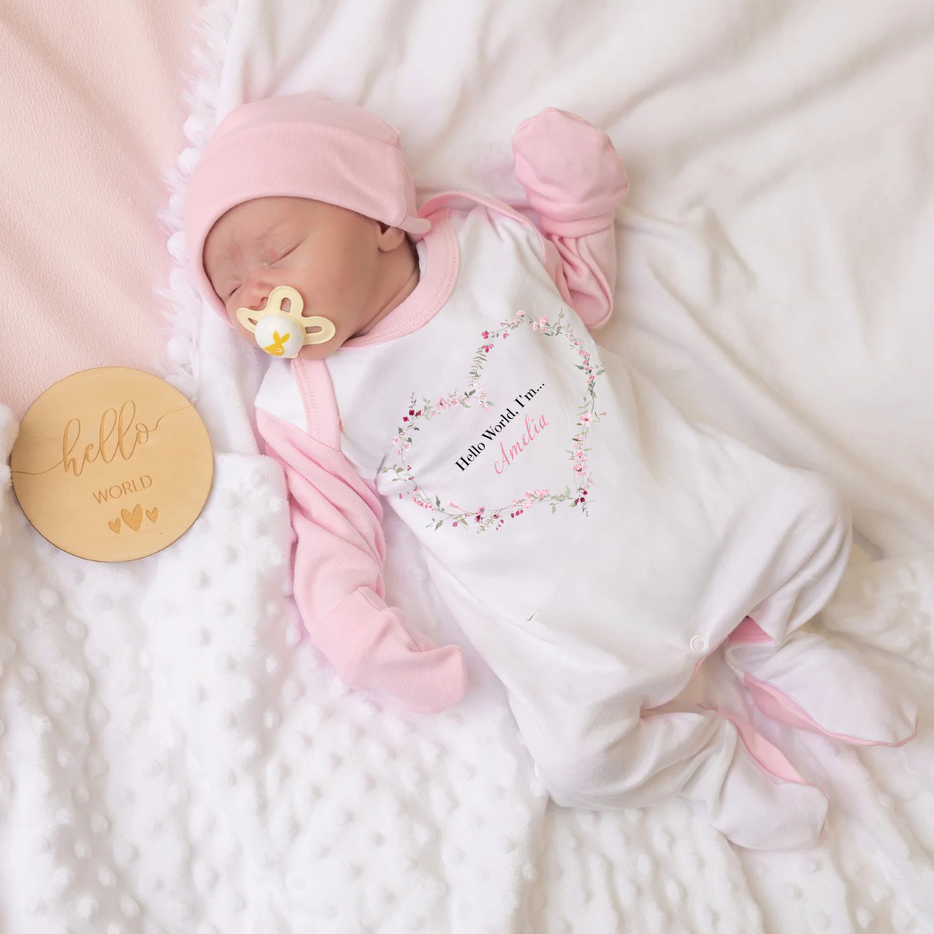 'Hello World I'm...' Pink Contrast Sleepsuit Heart Wreath