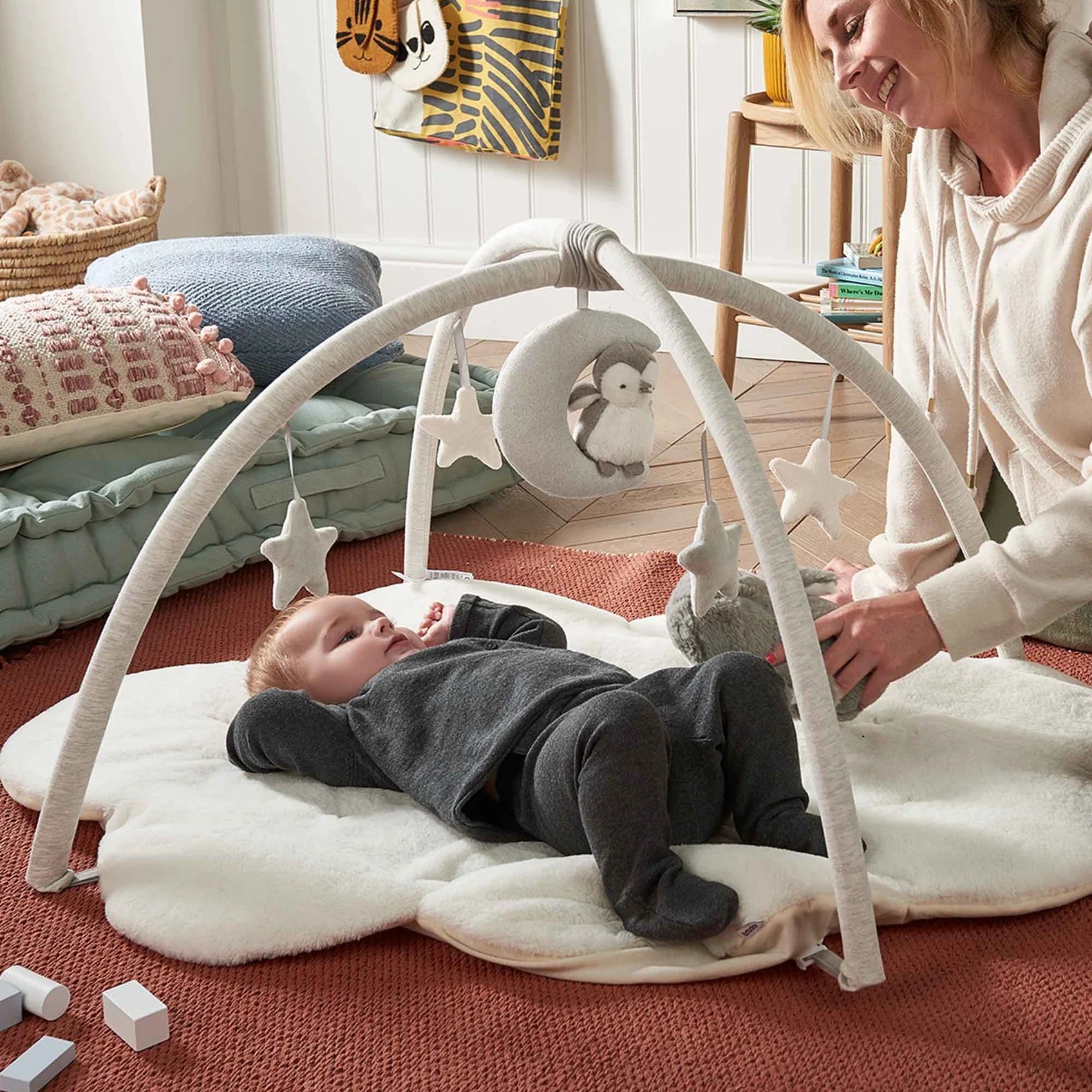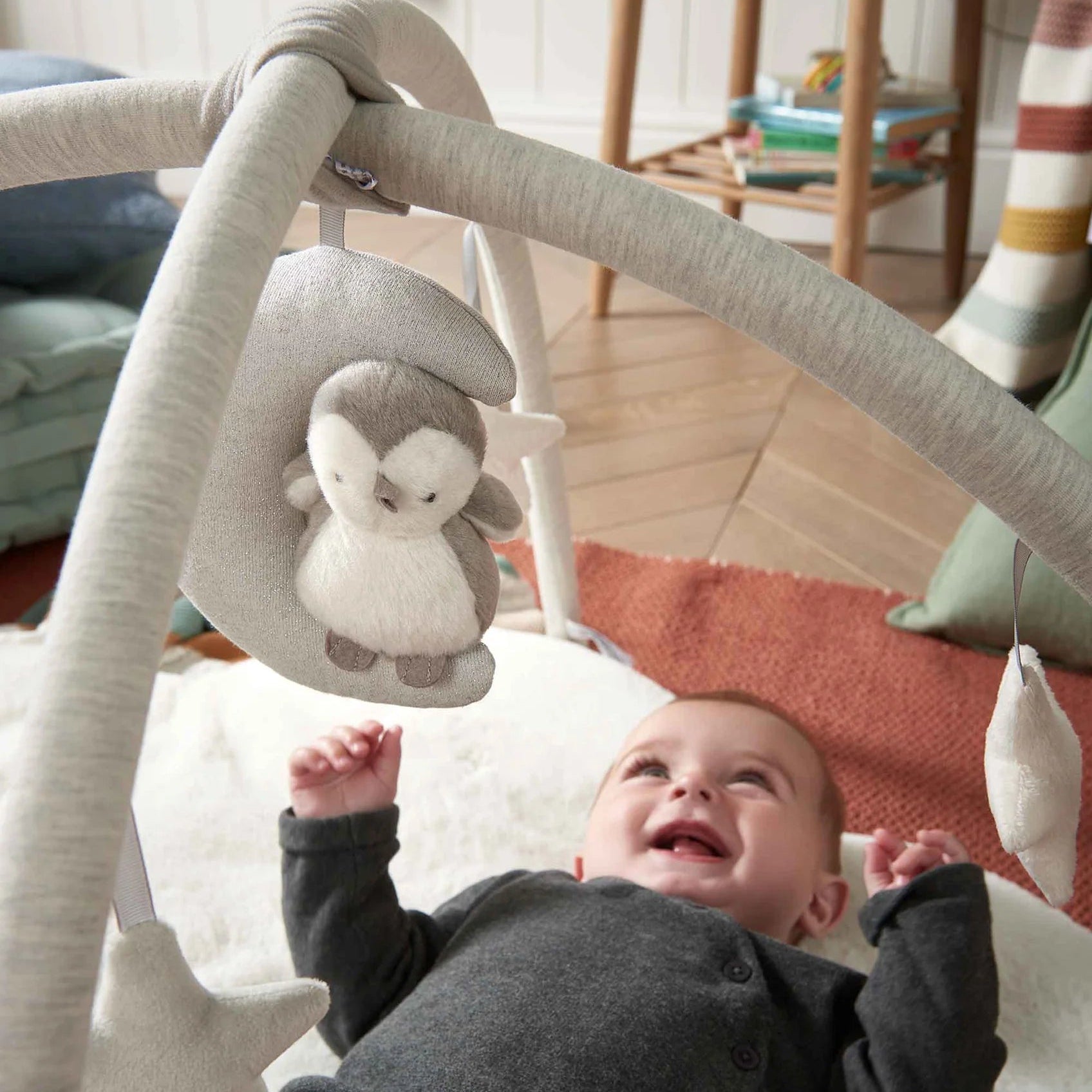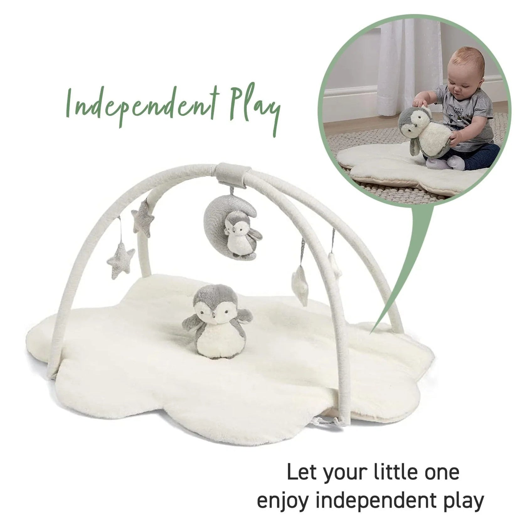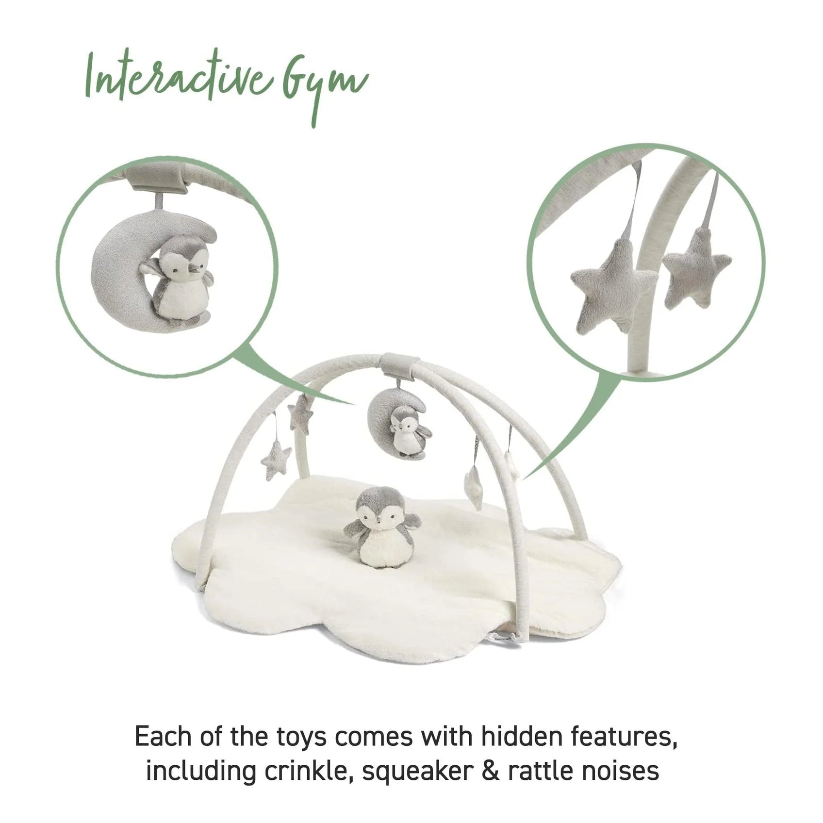 The perfect spot for some chill out time, independent play or to be entertained while you watch on! From the super soft padded mat notice how they discover hidden features - a rattle, crinkle texture, musical functions and detachable toys – before playing with their sweet penguin pal.