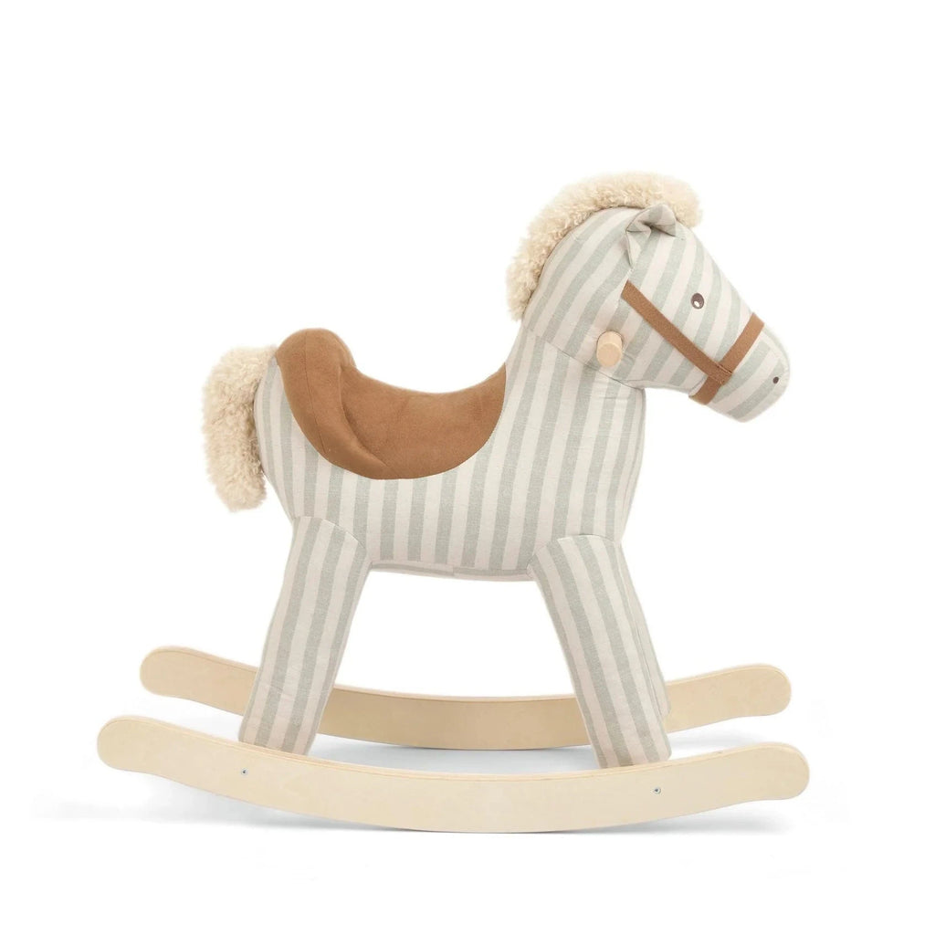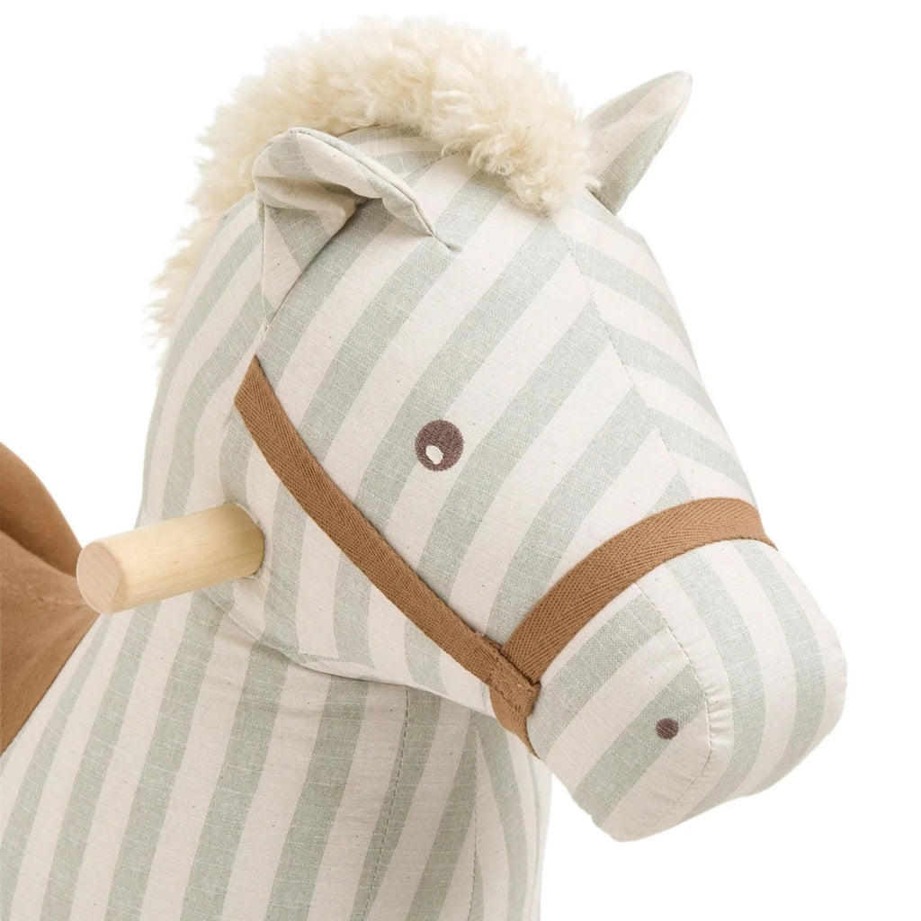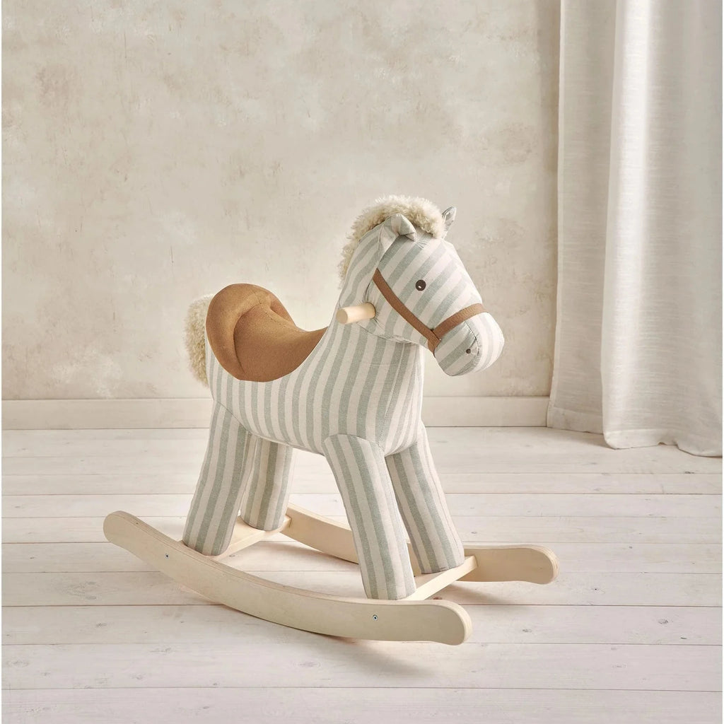 The perfect partner for their first rodeo…and many more that follow! We’ve given a classic rocking horse a stylish makeover, with a gentle sage green striped fabric and super-soft curled mane and tail.