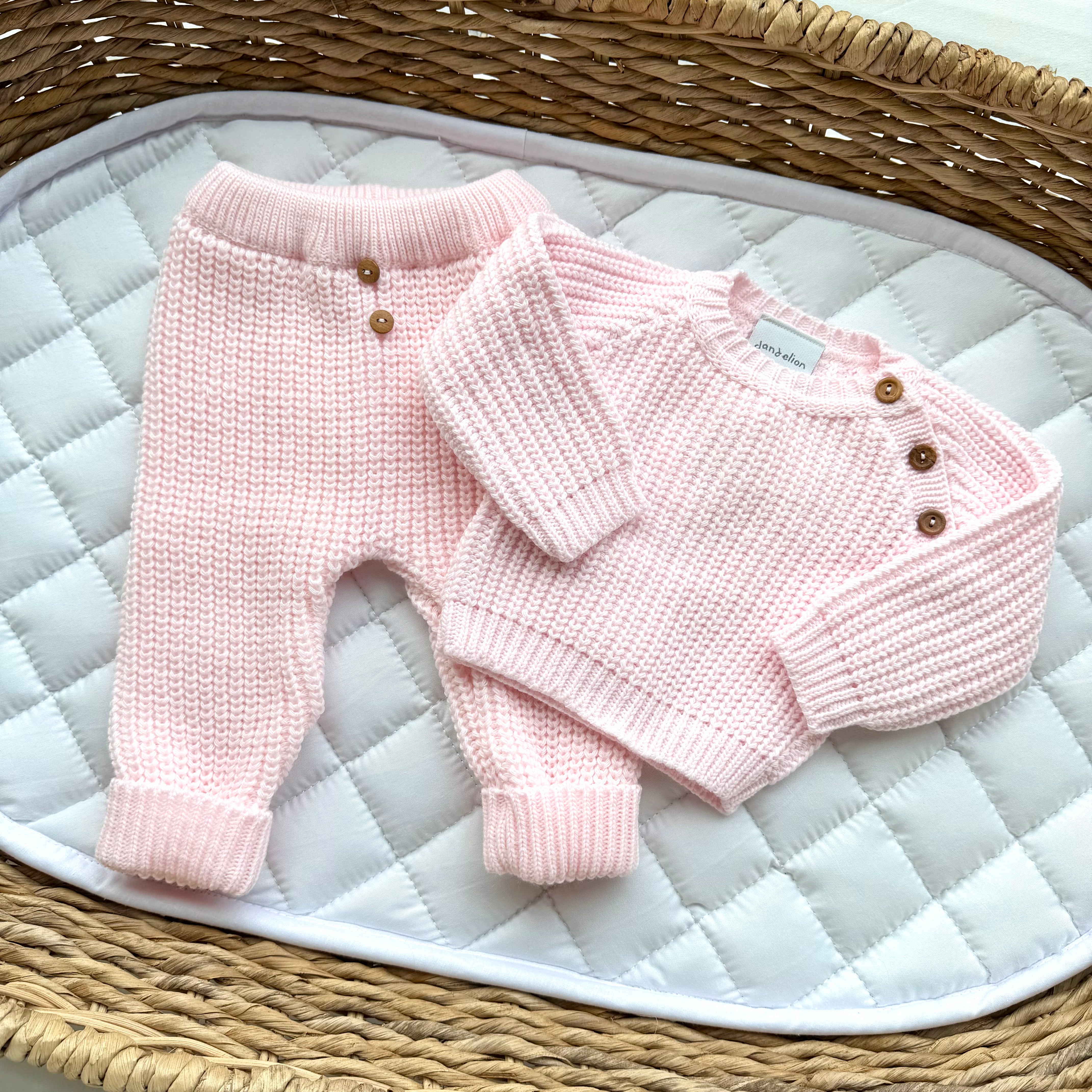 The perfect style for their first wardrobe, exclusive to M&R! A pastel pink long sleeved knitted fisherman style jumper with button fastening to the side. Matching knit trousers complete this adorable outfit.